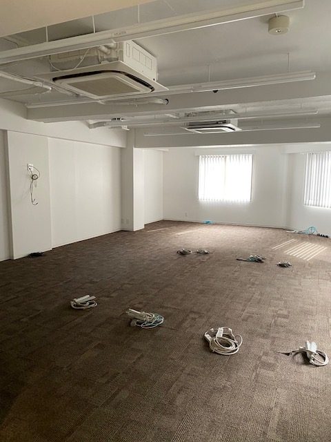 まず床が完成したところで、キャビネットなどの什器を会議室エリアから執務室エリアに移動して組立ていきます。業者さんが。
