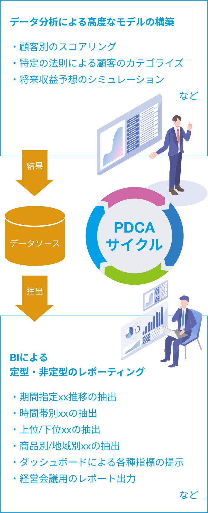 お客様が本当に見たいデータを経営の視点からサポートし、分析手法を確立します。確率した手法によりレポートを作成し、明確な指標を示すことで業務効率の改善につなげることが可能となります。更に、PDCAサイクルを回していくことで、常に最大の効果が得られるよう改善を図っていくことが重要です。